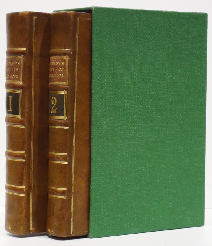 First English edition. 2 Volumes – volume 1 xviii + 365 pages, volume II xviii + 363 pages, frontispieces in both volumes, in volume 1 a portrait of Kolben, 27 plates – 2 folding, map in volume 2, plan, book plates on front paste down end papers, publishers advertisements on a separate leaf at the end of each volume, light foxing throughout, full leather rebacked and titled gilt on the spine - Medley's Cape of Good Hope, housed in a recent specially made green cloth slipcase, a very good set.
