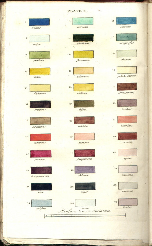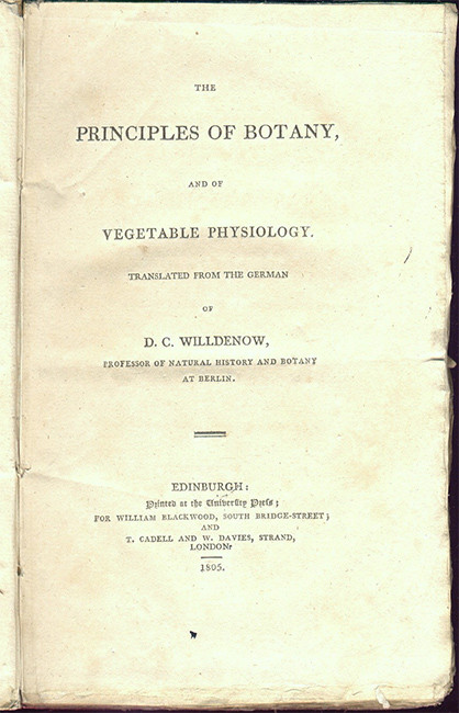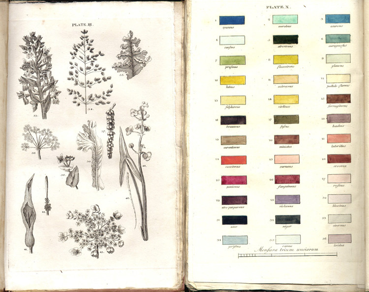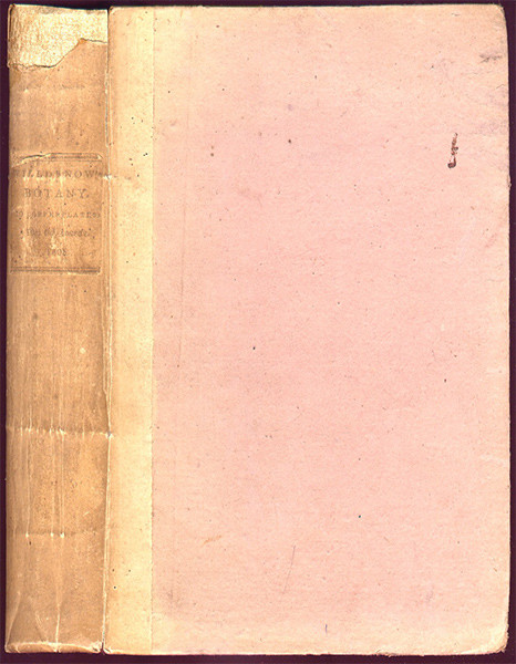 First edition: iv, 508 pages, 10 engraved plates, plate 10 is a colour key of the principal colours in plants (described on pages 197 - 199 of the text), original white parchment back (with paper title label) and pink paper-covered boards, the top of the spine is chipped with a portion missing and the front joint is splitting towards the top, edges uncut, contents crisp, a very good copy.