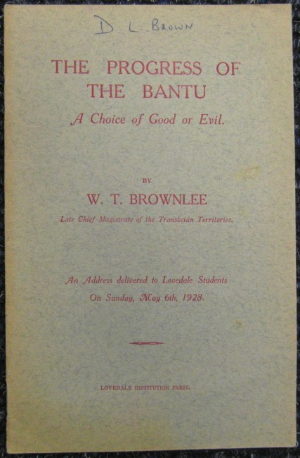 Original thin card wraps are strong and clean, owner's name to front. 14 pages held firmly in place by the original two staples. "An address delivered to Lovedale students on Sunday 6th May 1928"
