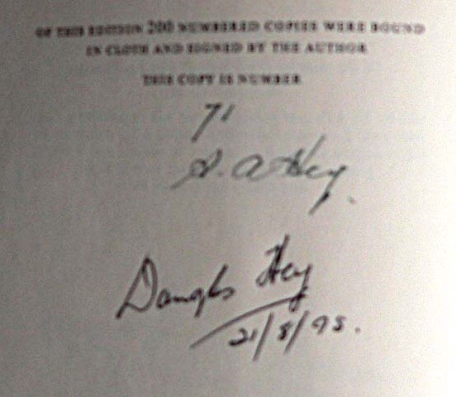 This particular copy is very special and unique in that it is the only known copy in existence that was signed by both father (author, S.A.Hey) and son (Dr Douglas Hey)! See accompanying photograph.