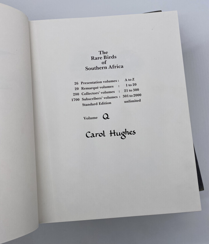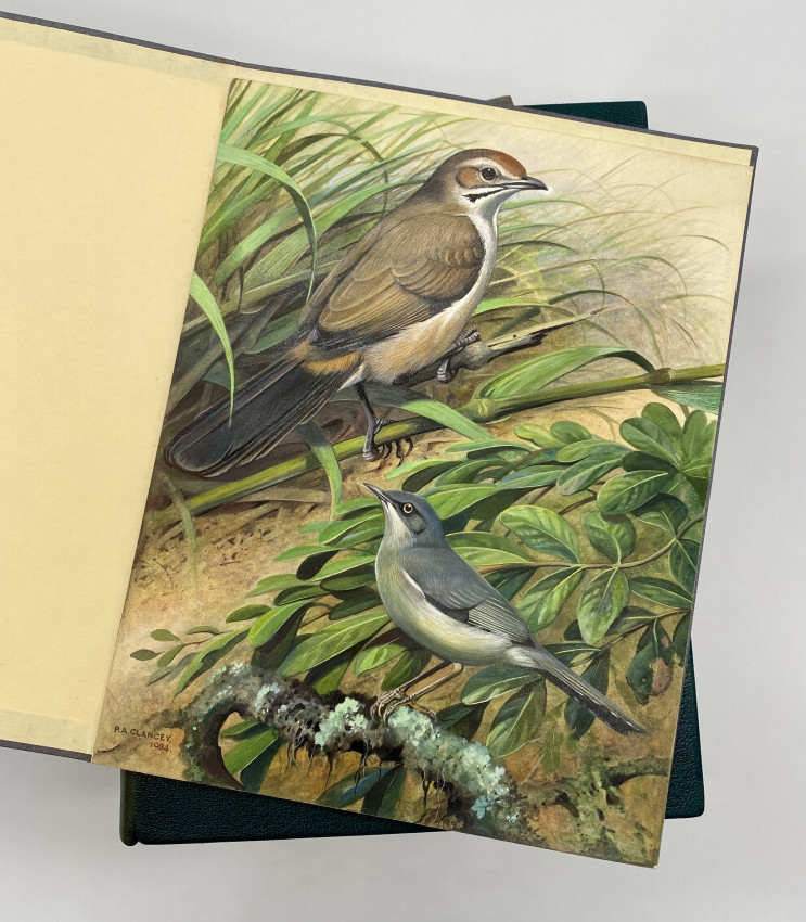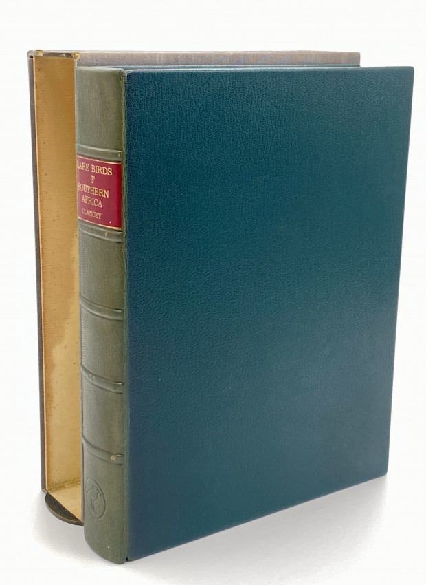 This is one (Q) of 26 (A-Z) presentation volumes, inscribed to Carol Hughes on the limitation page. These 26 volumes each contain a signed, original painting on paper by Clancey with a description of its subjects (in this case a Moustached Grass Warbler and Chirinda Apalis) pasted to the verso. The painting is protected in a grey, cloth covered wrapper within a separate compartment of the slipcase.