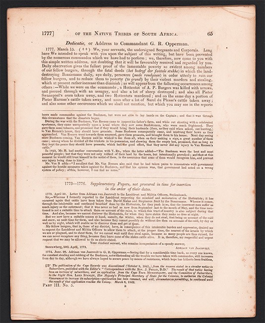 From the preface of the facsimile reprint of THE RECORD by Anna H. Smith she states that at first Government aid was available, but because of opposition from the influential Exeter House group and the SA Commercial Advertiser, financial support was withdrawn in July 1839. By means of public subscription it was possible to continue for a while, but as is evident from the “Circular” to the subscribers dated 5 October and appended to Correspondence between Donald Moodie Esq. and the Rev Philip (A.S. Robertson, 1841) sufficient support was not forthcoming. It would therefore appear that THE RECORD ceased after March 1842, if the note on page 65 of Part 111 has been correctly interpreted.