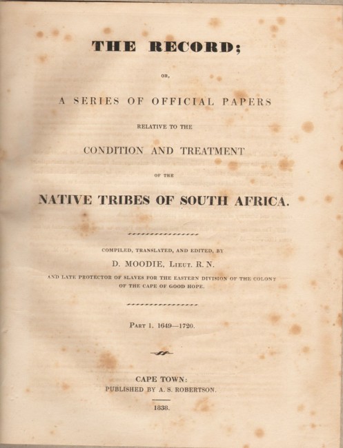 Donald Moodie, writing in his “History of the Battles” (1888) discusses his attempt to locate a complete copy of his father’s book in Cape Town in 1883, stating, ‘The late Mr Juta, inter alia, was applied to without success, and he surmised that success would be attended by the disbursement of about forty shekkels of gold.’ Copies which contain Part III with pages 65 – 112 are particularly scarce.