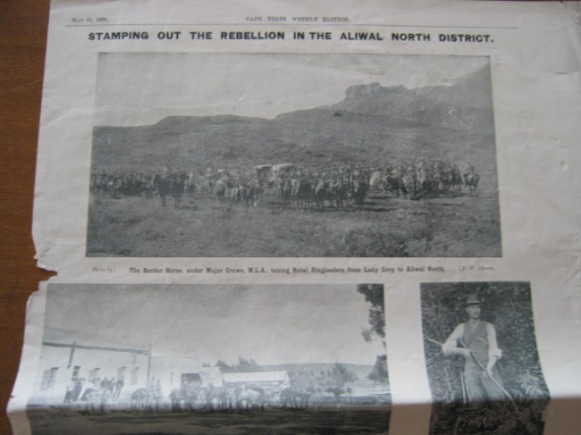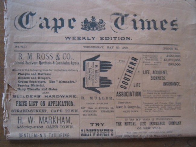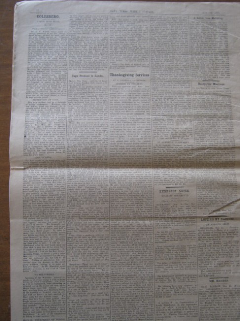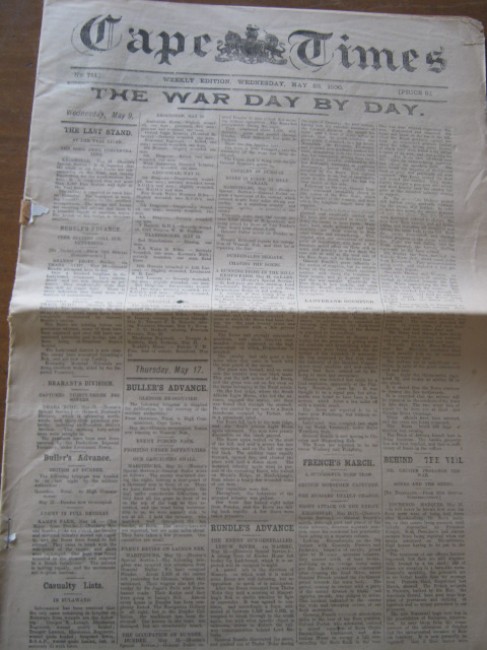 This complete copy of the newspaper has 4 pp of salmon-coloured advertising wraps (fair condition); a 2 pp photographic supplement (including "The Boer Prisoners at St Helena - General and Mrs Cronje", "Scenes in the Free State" and "Stamping out the Rebellion in the Aliwal North District") (good condition); and the 32 pp main newspaper, dominated by "The War Day By Day" and, in particular, all the news from Mafeking (very good condition).