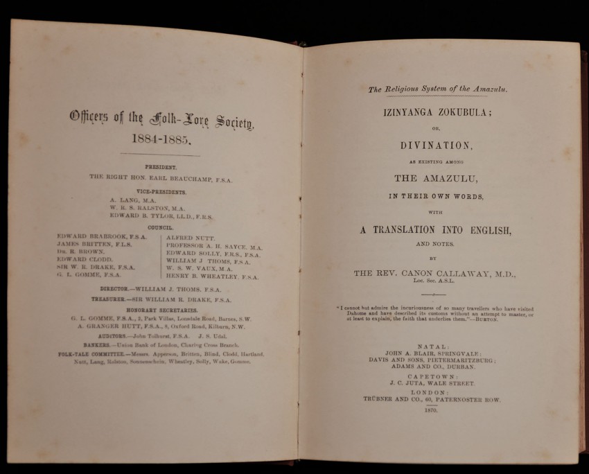 This work was originally published in three parts in wrappers with an incomplete fourth part, between 1868 and 1870. They were issued in a bound volume in 1870. Dr. Callaway presented unsold copies to The Folk-Lore Society and they issued them as Vol. XV of their publications in 1884. The copy on offer is one of the Folk-Lore Society issues and is effectively still a bound edition of the original printings. In the original terracotta binding with gilt and black decoration and lettering. An immaculate just about fine, crisp, unmarked copy of his scarce title.