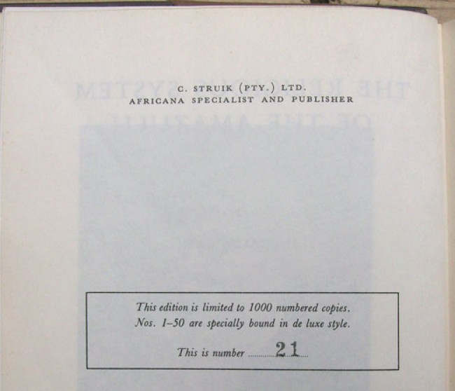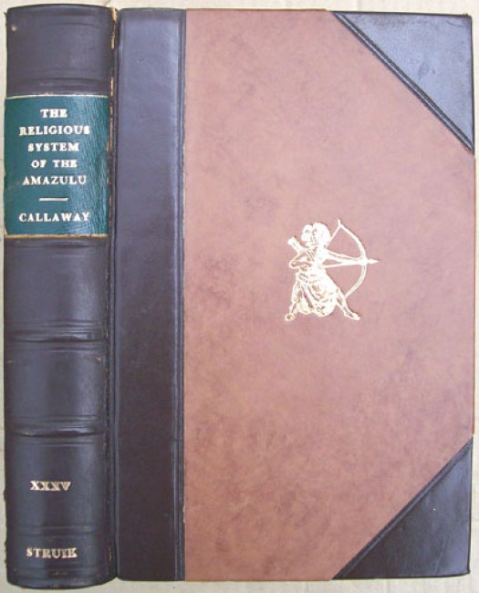 This is the 35th volume in the Africana Collectanea Series. An edition limited to 1,000 numbered copies, of which copy numbers 1 to 50 were specially bound in the "de luxe" style. Original brown leather spine and corners with a green title label on the spine with gilt titling and the publisher's device on the upper board. 8 prelims followed by the facsimile of the original printed by the Springdale Mission Press, with 448 pages and black and illustrations.