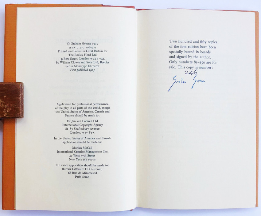 No. 246 of 250 copies signed by Graham Greene. A fine/as new unmarked copy in the original tan coloured cloth covered boards and dustwrapper. This constitutes the entire hardcover first edition as the trade edition of this title was issued in wraps.