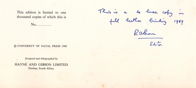 Published in an edition of 750 copies. This copy is unnumbered but bears the following inscription on the limitation page, ‘This is a de luxe copy in full leather binding 1969, RA Brown, Editor.’ However, the binding is the usual green cloth of the normal limited edition.