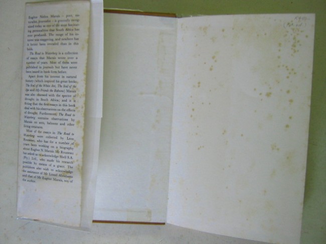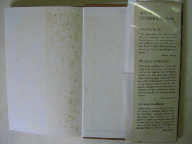 A collection of essays covering a wide range of subjects, from droughts to honey-guides, lions, insects and baboons, a very good cross-section of Marais\' work. Book is a good, tight copy, but with foxed end-papers and page edges. The jacket is good but has quite heavily spotted flaps, and chips and small tears to extremities, and faded spine. Protected by a Brodart plastic sleeve.