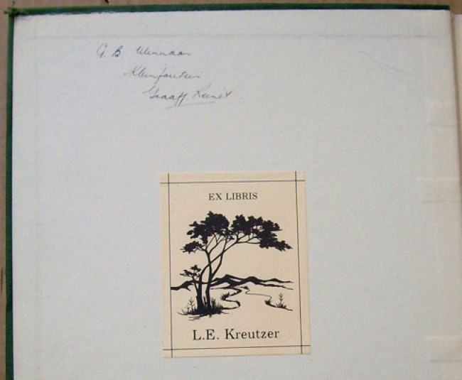 CONDITION DETAILS: The binding has some wear and a stain at the top right hand side corner of the upper board. The lower board also has this stain mark, but the contents of the book are not affected. There is a pen name, etc., on the front paste down as well as the L.E. Kreutzer book plate.
