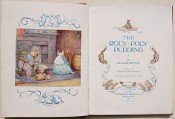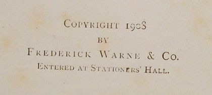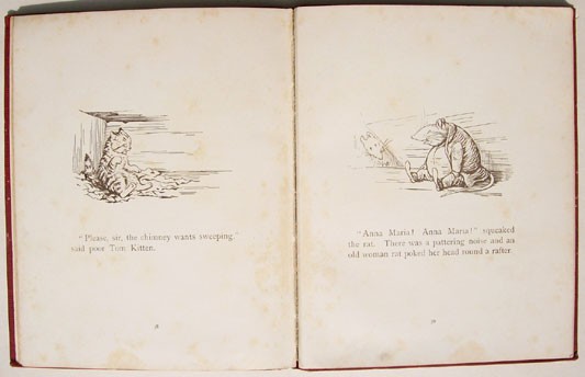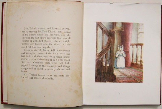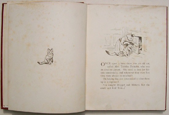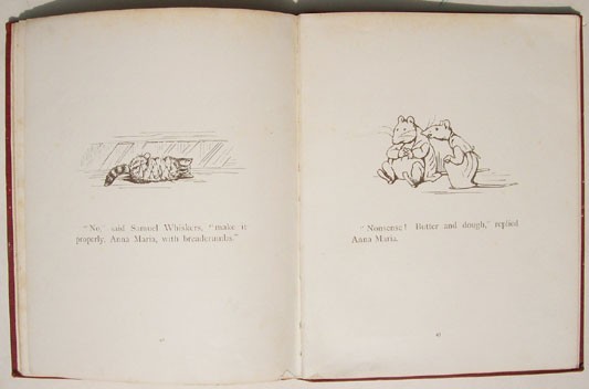 Original red cloth covered boards with bevelled edges, a pictorial onlay of Samuel Whiskers on the upper board, gilt titling on the spine, green and gilt titling on the upper board. Top edge gilt. Decorated end papers. 8 prelims, 70 pages, 18 full page colour plates including the frontispiece and black and white drawings.