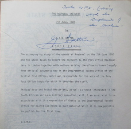 On 17th June Lt.Col.Greer, the Director of Military Postal Services, South Africa reported the Incident to the Secretary of the G.P.0. in London- On the 7th inst, about 2000 mail bags containing two week's mail for some units, four for others were captured by the Boers and destroyed, with the exception of two bags.