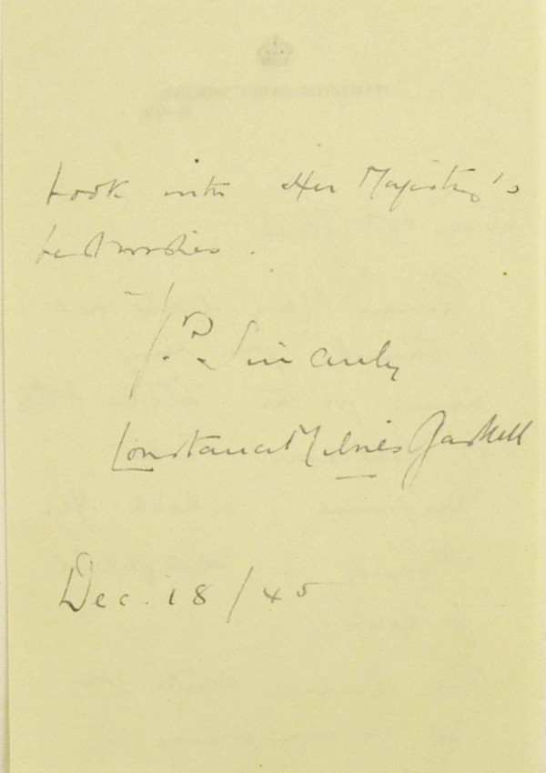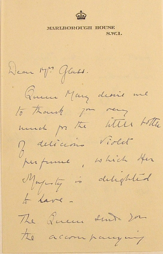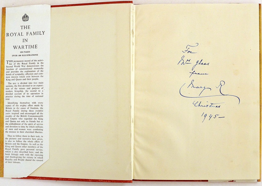 A 128pp. hardcover small 4to. book in dustwrapper with extensive photographs of the Royal Family and in particular King George VI during the Second World War. Inscribed by Queen Mary, the Queen Mother on the front free endpaper and dated 1945. Loosely inserted is a 2pp. single leaf letter on a Marlborough House letterhead from Lady Constance Milnes Gaskell to the inscribee, a Mrs. Glass, thanking her on behalf of the Queen for a gift of perfume and sending her the book with the Queen's best wishes. Lady Gaskell was the "Woman of the Bedchamber" or Lady in Waiting to Queen Mary.