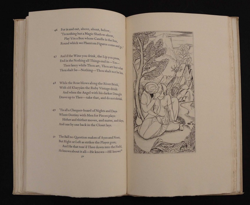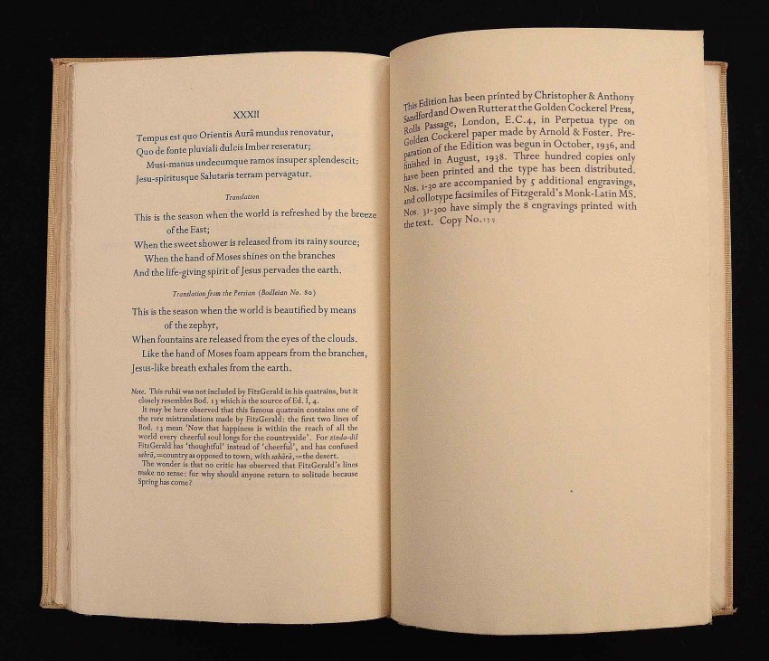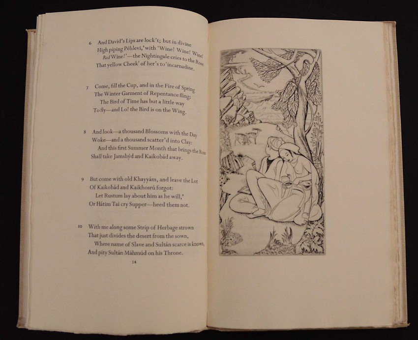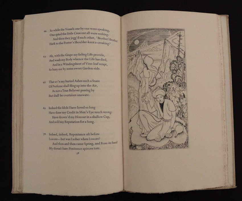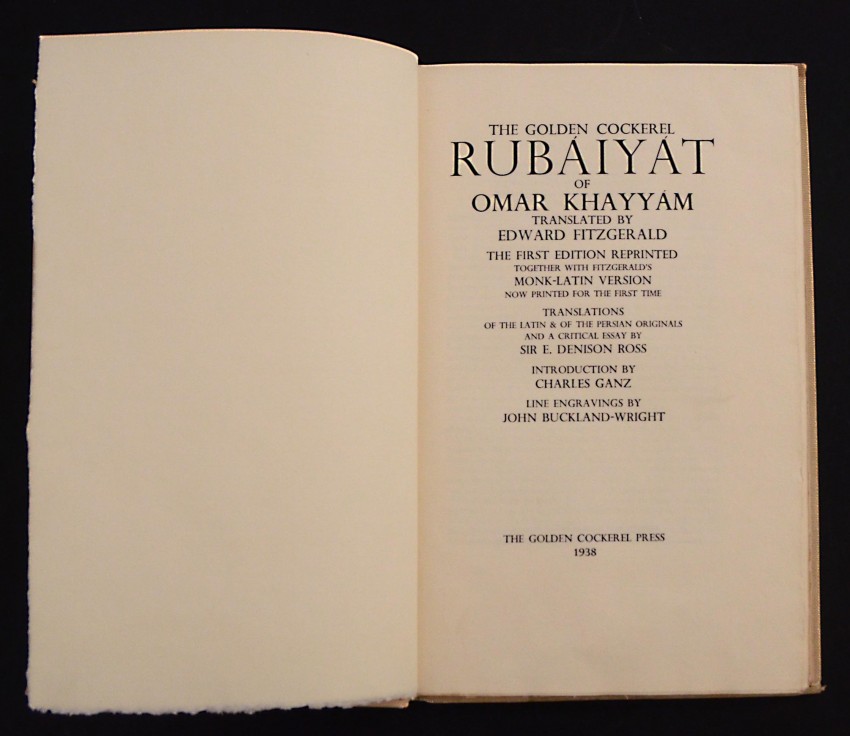 No. 139 of 300 copies constituting the entire edition of this Golden Cockerel Press book, one of the highspots of this press and also one of the choice editions of the Rubaiyat. With 8 fine line engravings by John Buckland-Wright. In the original quarter cream morocco and buckram binding with a gilt design on the front board. Top edge gilt and other edges uncut.