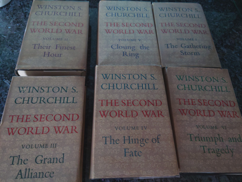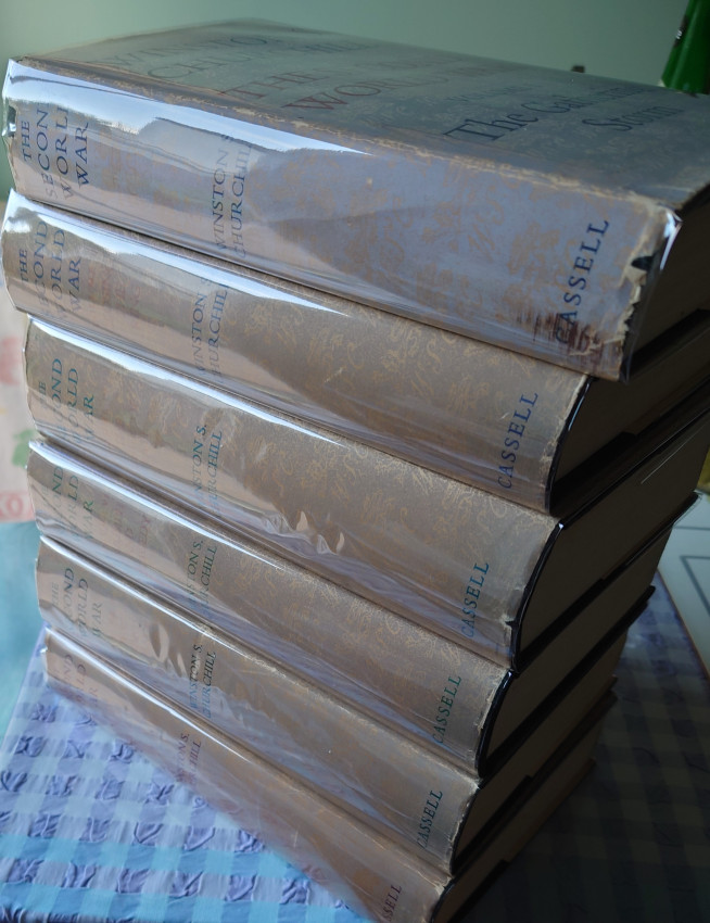 Published by London: Cassell, 1948. 1st Editions. Hardcover. Condition: Very Good+. Dust Jacket Condition: Good-. First editions. Six volumes. Vol 1 The Gathering Storm,1948; Vol 2 Their Finest Hour, 1949; Vol 3 The Grand Alliance, 1950; Vol 4 The Hinge of Fate, 1951; Vol 5 Closing the Ring, 1952; Vol 6 Triumph and Tragedy, 1954. Spines of dust jackets a little sunned and heads of spine slightly chipped. These jackets of economy standard and never in perfect condition. Top stain red uneven in vols. Cloth near fine. A bright set of this masterpiece of historical war writing.