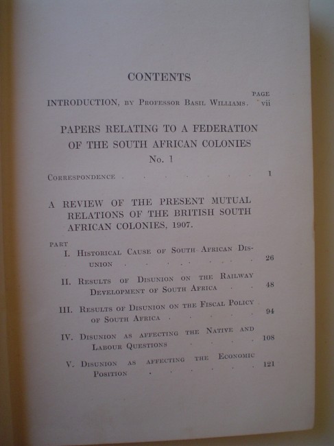 Papers relating to a Federation of the South African Colonies. Chapters inside: Historical cause of South African Disunion. Results of Disunion on the Railway development of South Africa, results of Disunion on the Fiscal Policy, Disunion as affecting the Native and Labour Questions, Disunion as affecting the Economic Position, National Expansion....