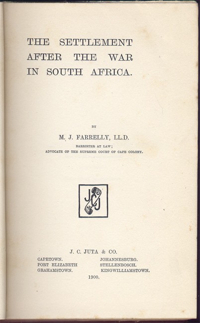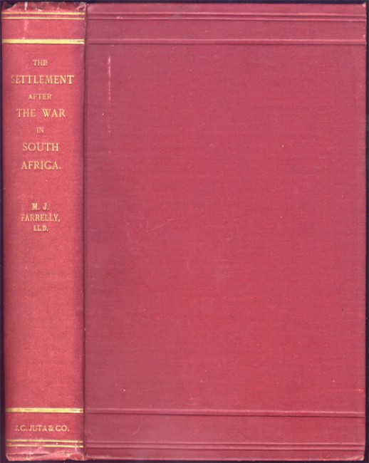 Farrelly was Barrister at Law and Advocate of the Supreme Court of Cape Colony. Mendelssohn l:535. The author \'was of opinion that the issue between British or Dutch supremacy meant life or death to the Empire, and he refers to the vacillation displayed by the Home Government for nearly 100 years (1800-1900) and to the effect it has had on the Boers and their aims. The policy of the Afrikander Bond is discussed, more especially as to the denial by its leaders that there was any design to oust British influence, but the author maintained that the Afrikanders were taught to \'eliminate all that is British\' out of which was evolved the resolve to \'drive the British into the sea.\' .... Dr Farrelly was appointed Advisory Counsel to the Transvaal Republic, and issued several memoranda to the Free State and Transvaal Volksraads. .... The author advocates absolute and permanent annexation, conciliation of Dutch sentiment, promotion of federation, and the establishment of English as the official language after the war\'