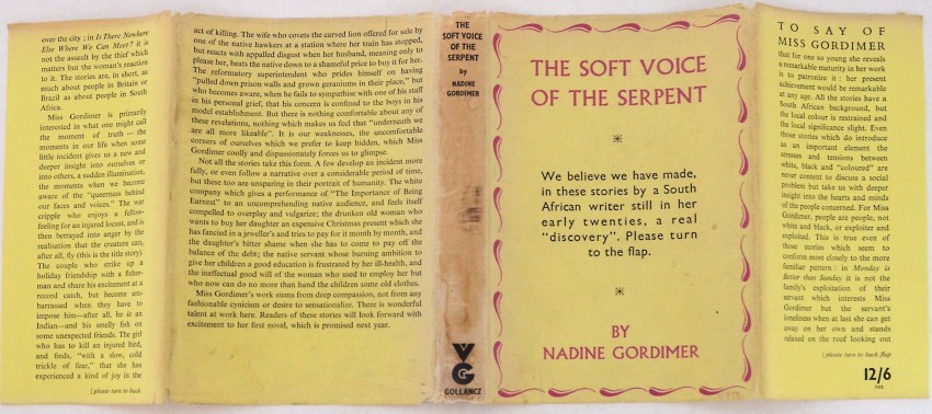 The first UK edition of the Nobel Laureate's second book and first to be published outside of South Africa, following Face to Face published in Johannesburg in 1949. The front panel of the dustwrapper states: "We believe we have made, in these stories by a South African writer still in her early twenties, a real discovery".