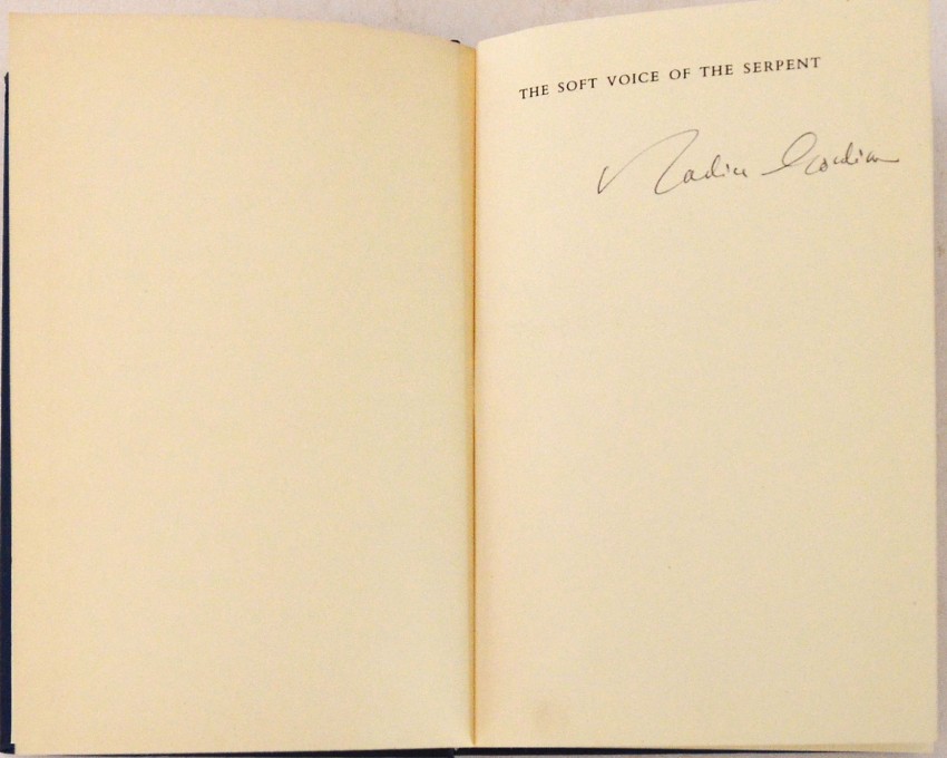 A fine unmarked copy in the original blue cloth. In a very good plus bright dustwrapper which has some light edge wear with one 1cm. closed tear and a slightly darkened spine which has a few mm. of loss at both extremes. A better than average copy of this fairly friable dustwrapper. Signed by Gordimer on the half-title page.
