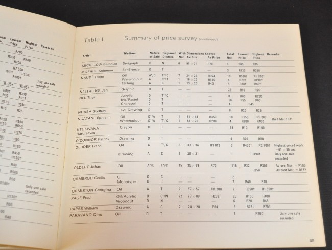 The South African Art Market 1971/72: A Handbook for Collectors. Johannesburg: Art Institute SouthAfrica. Black and white illustrations by Nils Burwitz. A fascinating step into the past - a look at the SA art market in 1972 with prices that will make you wish for a time machine. Pierneef paintings going for R1000 and an entire Laubser exhibition receiving record sales of a total of R2400! Chapters on gallery owners, fakes,auctions, and lists of all major artists'sales and prices achieved.
