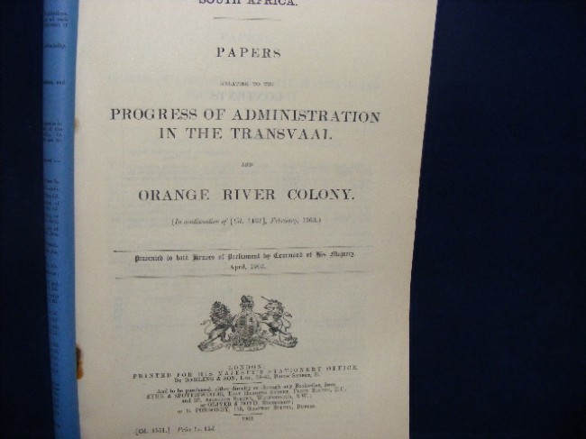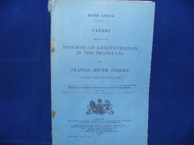 Contained in a 202pp Report on the progress of Administration in the Transvaal and orange River Colony. A further full page map accompanies a Report of the Native Department.
