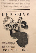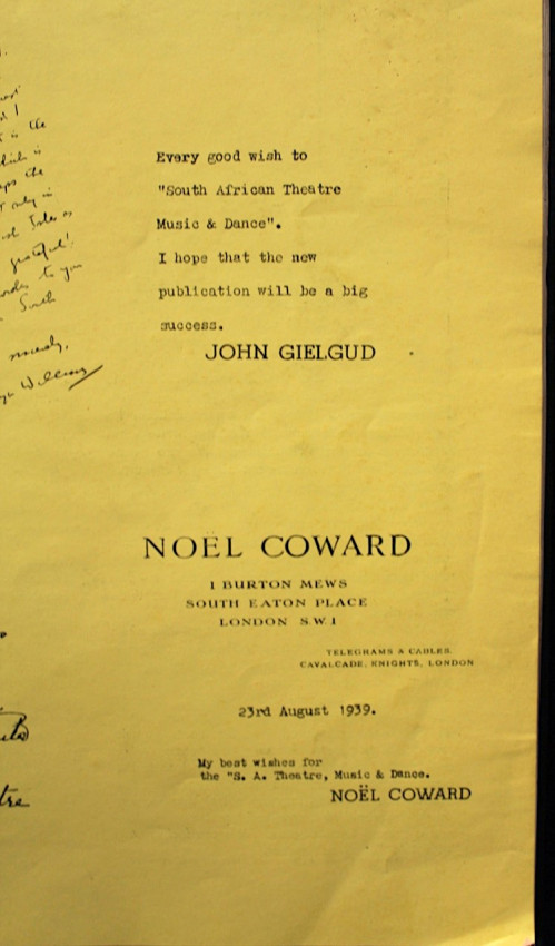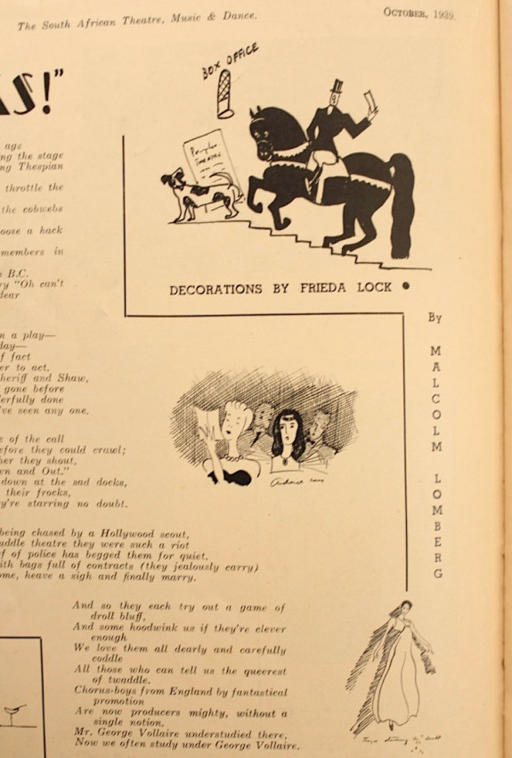 Messages from famous international personalities of the day on page 5 wishing this newly launched entertainment magazine all success, which, sadly, failed after only two issues. This magazine was also an advertisement for the "New Group" and features illustrations by Frieda Lock, Russel Harvey, Gregoire Boonzaier (founder of the New Group), and Lippy Lipshitz.