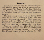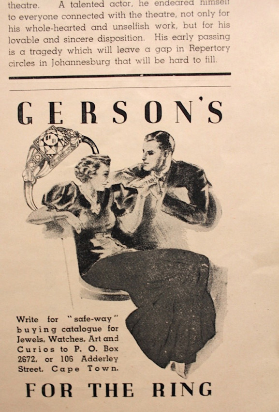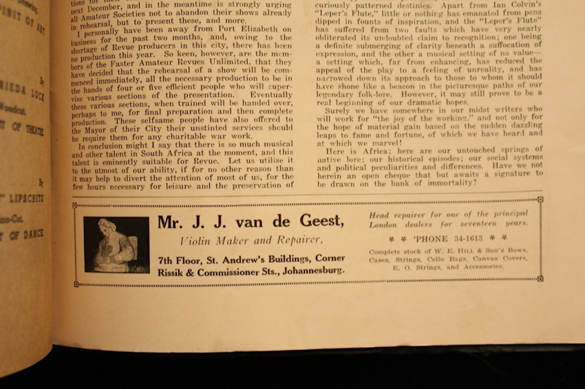 Period adverts, notably Weet Bix breakfast cereal - a South African standard. Interesting advertisement for violin and instrument repairs by violin maker J. J. van de Geest in Johannesburg, whose instruments today are quite collectible.