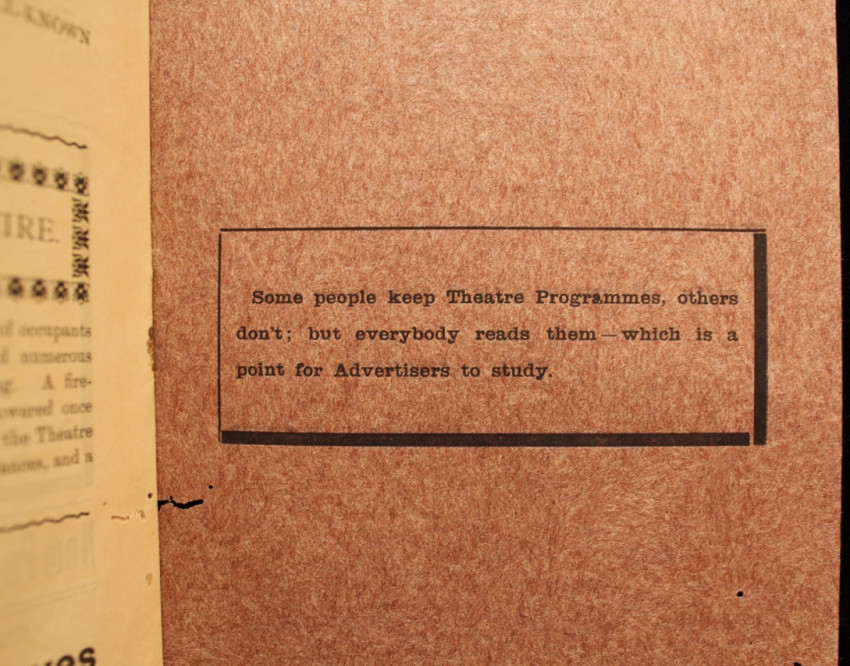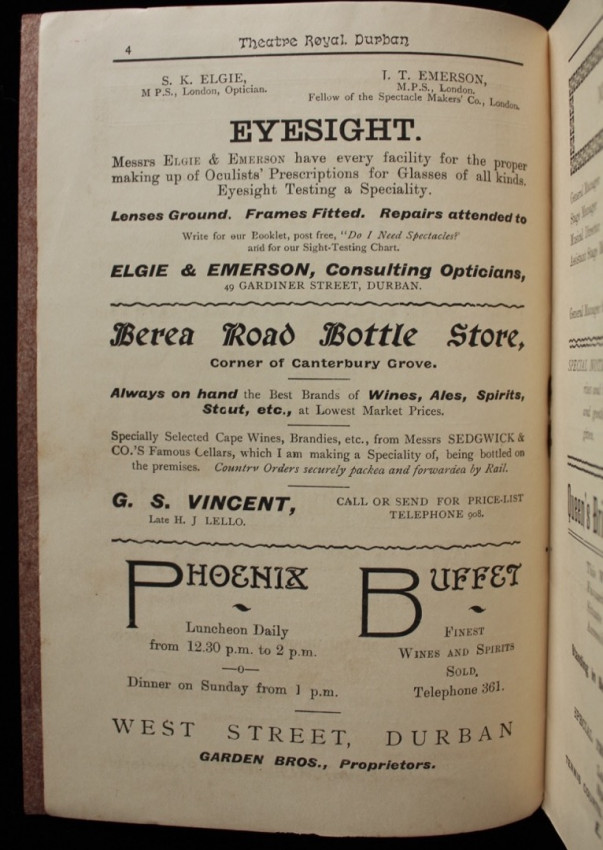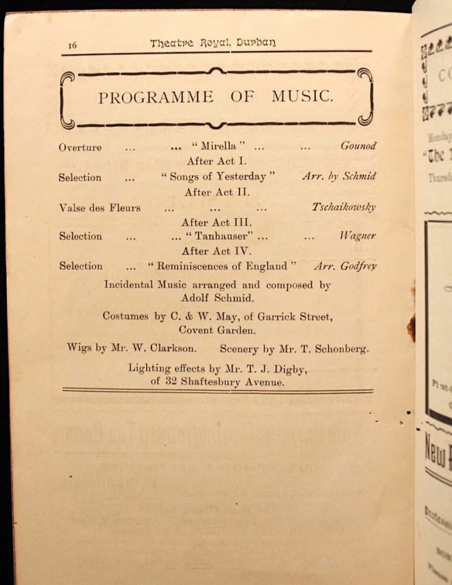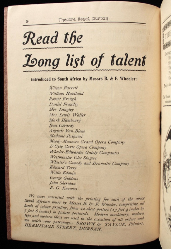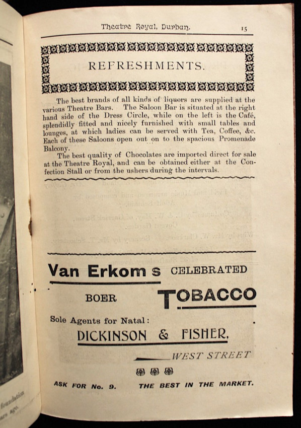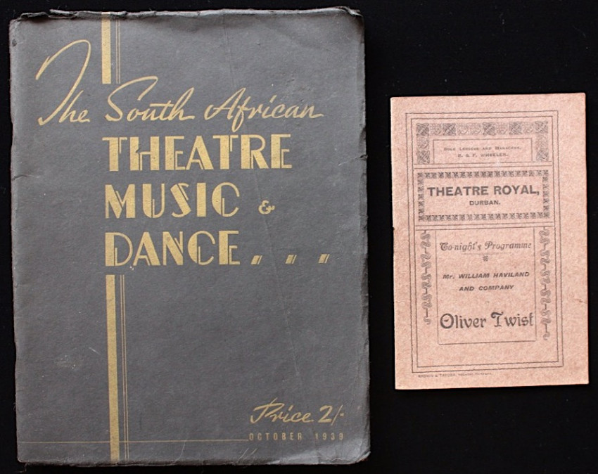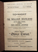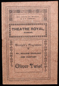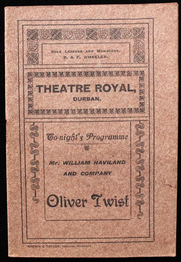 Included is a circa 1910's theatre programme of the Theatre Royal, Durban, for a presentation of Oliver Twist by Charles Dickens. Contains a short list of the management team, prices of admission, list of cast members, period adverts and theatre fire warning.