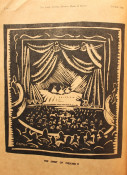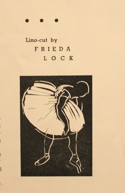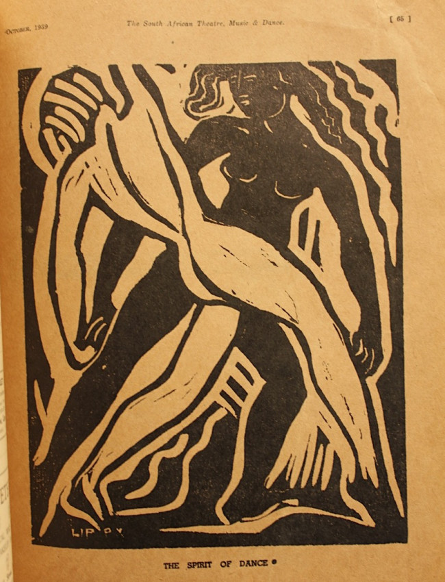 Full page charcoal drawing of "The Spirit of Art" by Russel Harvey on page 15, a full page woodcut of "The Spirit of Theatre" by Frieda Lock on page 16, and a full page lino-cut of "The Spirit of Dance" by Lippy Lipshitz on page 65.