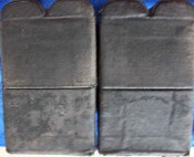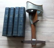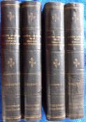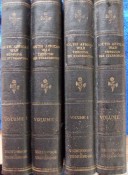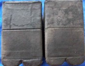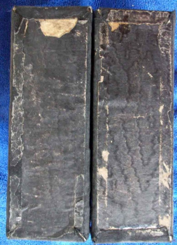 Two cloth covered boxes manufactured to appear to be books, with decorated and gilt lettering to the spines. The dark deep blue boxes open to access 36 cards per case. The linen boards are worn at the base and sides, there is some wear to the boxes. Boxes size 19 X 11cm each.