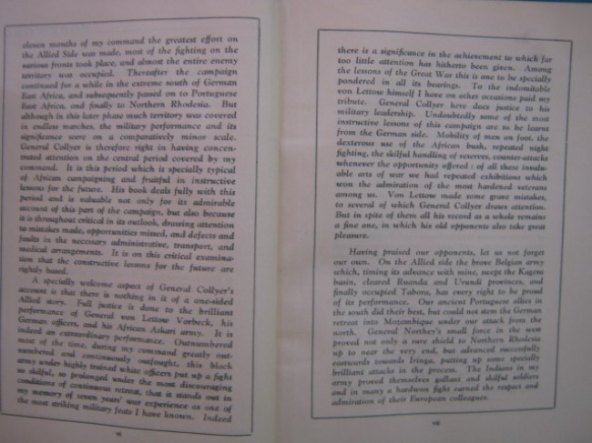 In his foreword General Smuts notes that Collyer, his chief of staff in the East Africa campaign, was "in a special position to know or to learn the circumstances and difficulties of the task which faced us". However, "there is nothing in it of a one-sided Allied story. Full justice is done to the brilliant performance of General von Lettow Vorbeck, his German officers and his African Askari army."