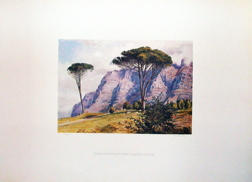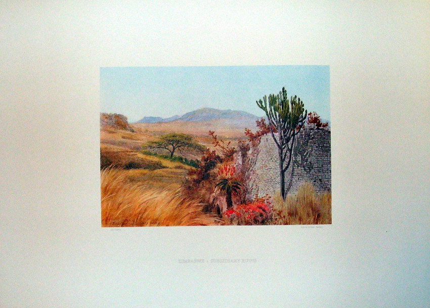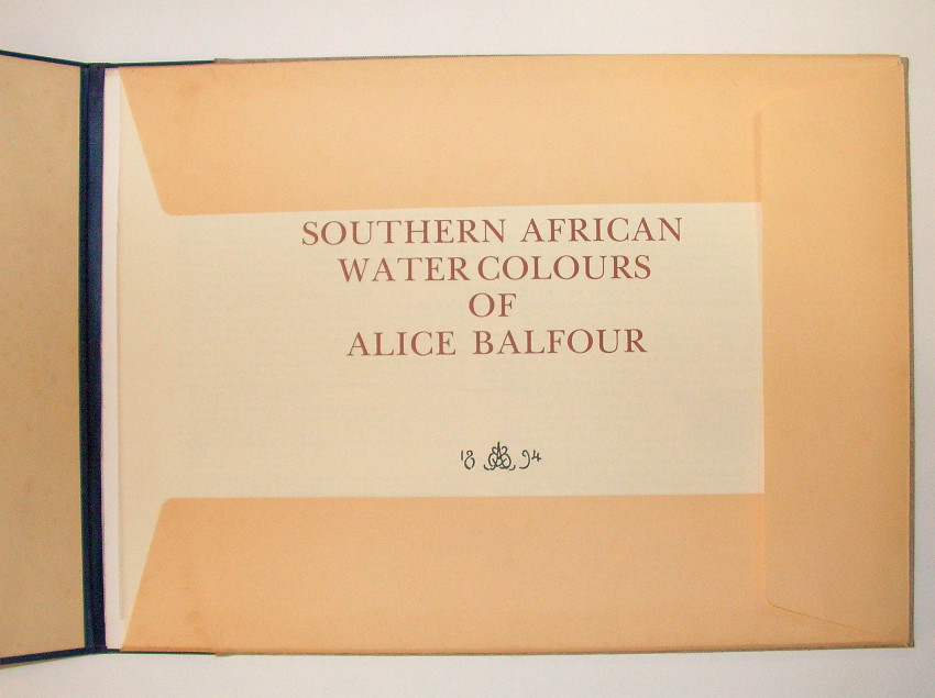 Perhaps best known for her "Twelve Hundred Miles in a Waggon", in which she recounted experiences during a trip during the 1890s through South Africa, Bechuanaland and the territory of the British South Africa Company, "Alice Balfour possessed in great measure a faculty for recording the striking visual beauty of southern African scenery. ... Alice Balfour brought to her studies of African scenery an imaginative sympathy for genius loci, the spirit of places ..." The highly evocative pictures are as follows: 1) Table Mountain from the Garden, Groote Schuur, April 1894; 2) Tati River, 27 June 1894; 3) Granite Rocks, about 2 miles from Bonsor Reef, 15 July 1894; 4) Zimbabwe (Subsidiary Ruins), 29 July 1894; 5) Veldt about 6 miles S. of Fort Charter, 6 August 1894; 6) About 10 miles S.E. of Salisbury on Umtali Rd, 15 August 1894; 7) On the road between Salisbury and Umtali, about 60 miles from Salisbury, 19 August 1894; 8) Near Fischer's Farm, between Salisbury and Umtali, 21 August 1894; 9) Between Salisbury and Umtali, about 4 miles W. of the Devil's Pass, 24 August 1894; 10. About 7 miles E. of Massi Kessi on road between Umtali and Chimoio, 30 August 1894.