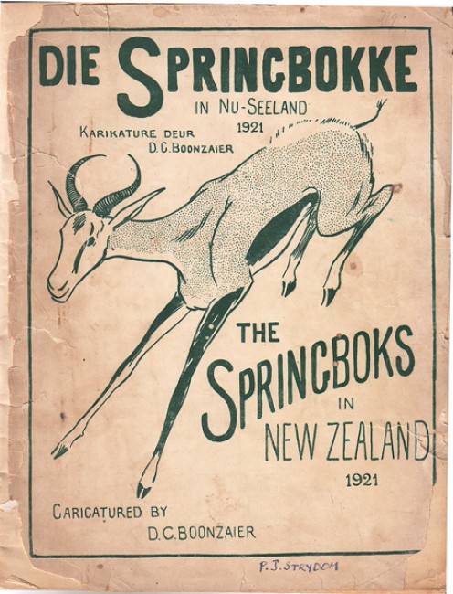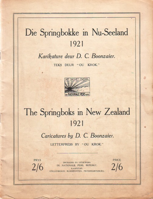 Bilingual Afrikaans/English booklet, featuring the team and management which toured New Zealand. 69 pp including 31 full-page caricatures by the renowned cartoonist D C Boonzaaier. The outer wraps are loose and the edges are severely chipped. Inside tp has a few nicks but the rest of the booklet is in good condition.