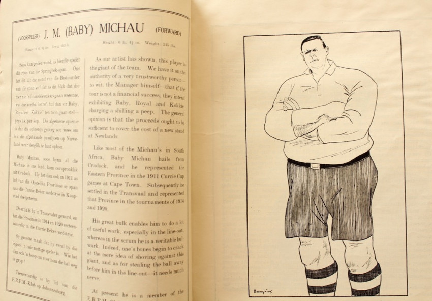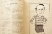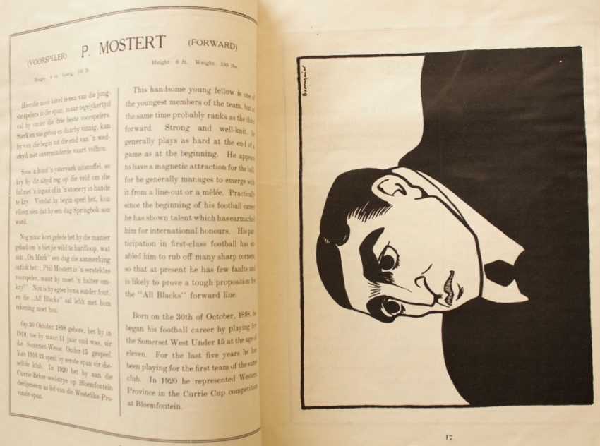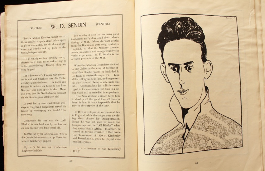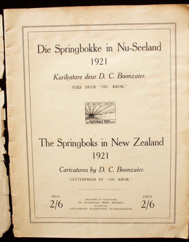 64pp. Caricatures of the Springbok Rugby Team that toured New Zealand in 1921, done by the famous caricaturist of the day, D. C. Boonzaier. Bilingual text in two separate columns containing short humorous biographies of the players with accompanying caricature on the facing page.
