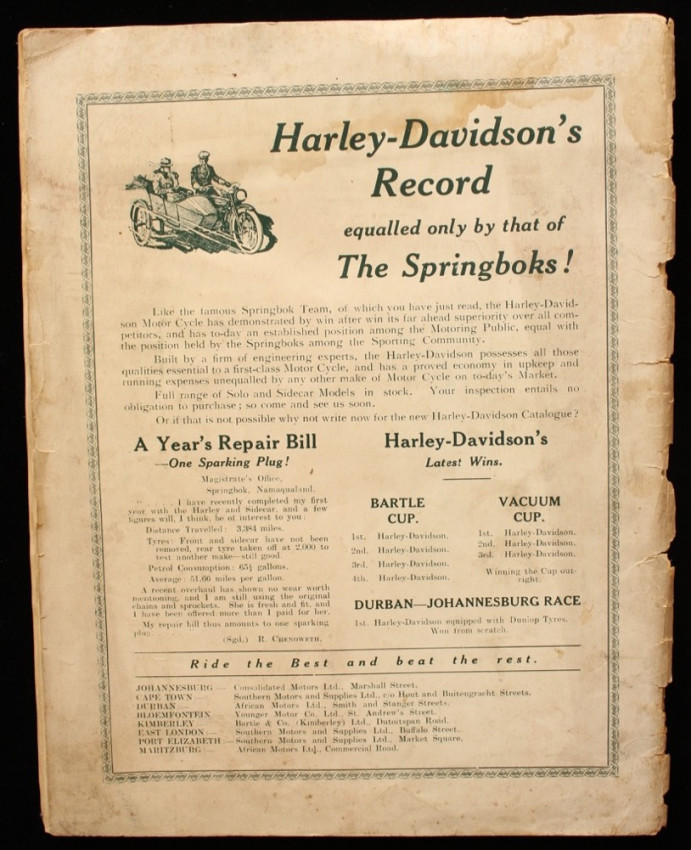 Rear panel contains a vintage advert for Harley-Davidson motorcycles.