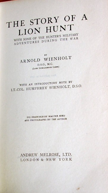 He had published The Story of a Lion Hunt (London, 1922), an account of his adventures on safari and in World War I, and gone lion-hunting on four occasions between 1923 and 1929. A man of 'ruthless integrity and exacting truthfulness', he abhorred sentimentality and exaggeration. Consequently, his books understated his deeds. An 'uncompromising individualist', he had affection for the peoples of Africa. Wienholt lived much of his life alone, and died alone for a cause which he embraced eagerly and with passion.His Queensland estate was sworn for probate at £174,978. (Australian Dictionary of Biography)