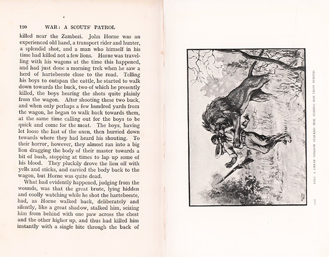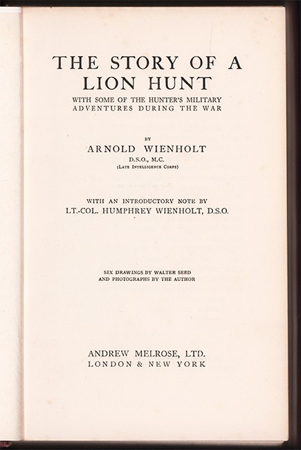 Czech (Kenneth) An Annotated Bibliography of African Big Game Hunting Books 1785 -1999, (new edition 2011) page 255: Prior to the outbreak of the Great War in 1914, Wienholt enjoyed lion hunting near the Okavango River, and relates several exciting incidents including a severe mauling he received. Though there are additional encounters with lion and leopard, more than half of his work recounts the fighting in East Africa against the Germans and their askaris.
