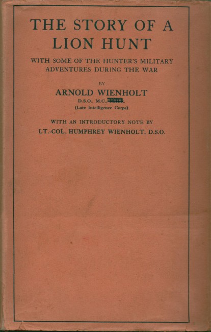 Wienholt (Arnold, DSO, M.C.) The Story of a Lion Hunt. With Some of the Hunter’s Military Adventures During the War., by …, With an Introductory Note by Lt.-Col Humphrey Wienholt, D.S.O. Six drawings by Walter Seed and Photographs (19). Andrew Melrose, Ltd., London and New York. 1922.