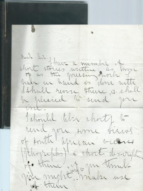 As the address is given as Matjiesfontein, it could have been written during her stay there between 1890-1892. The short stories referred to could possibly have been STORIES, DREAMS AND ALLEGORIES or THOUGHTS ON SOUTH AFRICA, which were both published posthumously.