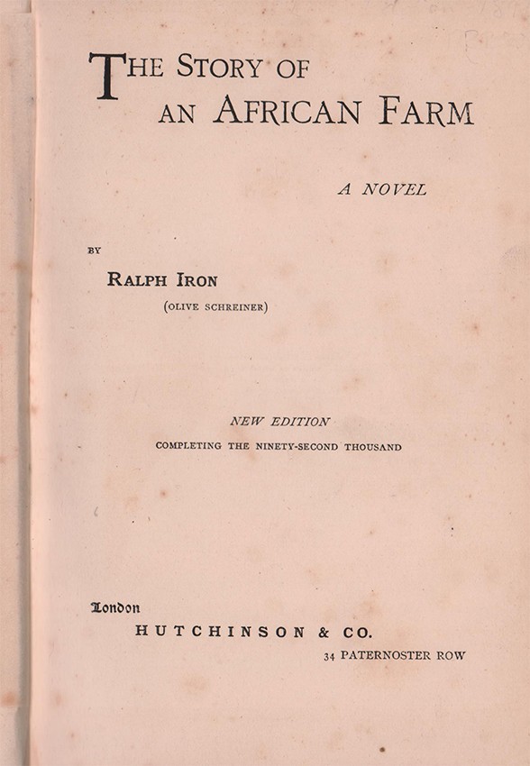 The Story of an African Farm' was first published in two volumes in 1883 under the pseudonym Ralph Iron. It was reissued in 1887 with Olive Schreiner's name appearing in brackets after Ralph Iron on the title page and with her name in gilt on the spine.