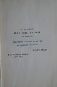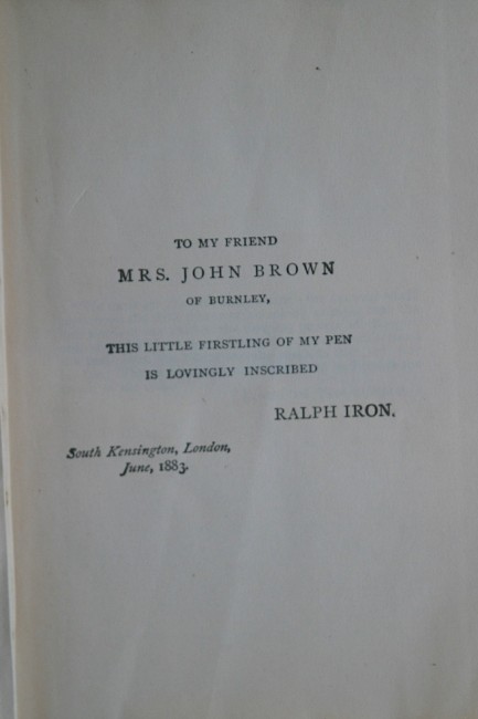 Story Of An African Farm By Ralph Iron (Olive Schreiner). Hardcover. Decorated cloth cover. 391 pages; endpapers yellowing, previous owner's signature on ffep. Overall very good condition with minor wear. Chapman and Hall accepted African Farm on the recommendation of a reader's report by the eminent novelist, George Meredith. Published in two volumes in January, the novel proved an immediate success, and a second edition quickly followed. More than a dozen editions appear in Schreiner's lifetime.