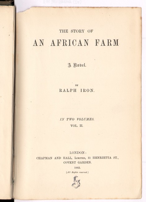 suggestion that she should add a few sentences to make Lyndall marry her Stranger in secret, otherwise 'the British public would think it wicked, and Smiths, the railway booksellers, would not put in on their stall! Olive described the incident to Havelock Ellis some thirty years later; then, she said, she told Chapman to 'leave the book alone or she would take it elsewhere. He climbed down at once.' (quoted in 'Olive Schreiner' by Ruth First & Ann Scott). So it seems that the publisher thought the book a rather risky venture and put out a small edition to test the market. As a new impression was required after only six months it is likely that the first edition might have been as small as 500 copies. '...her book was finally accepted in the middle of 1882 by Chapman and Hall. Its publication in 1883 under the pseudonym of Ralph Iron was something of a literary sensation and brought her into contact with a widening circle of poets and writers,...(Olive Schreiner Letters, Volume I: 1871 - 1899, Edited by Richard Rive).
