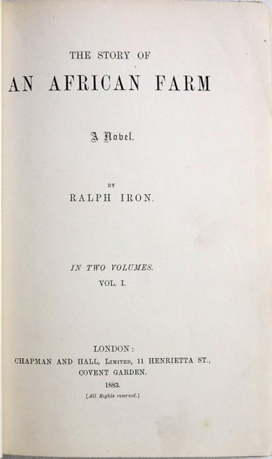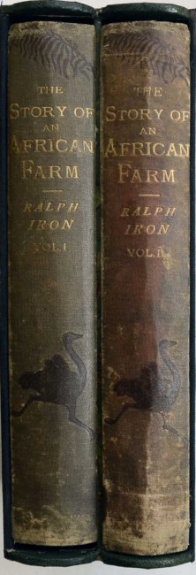 The very scarce first edition in two volumes of this work - arguably THE highspot of South African literature, published under the pseudonym "Ralph Iron". The entire printing of this first edition has been suggested to be about 500 copies - some say only 300! Most of these went to libraries and are no longer in collectable condition. Copies in the original olive cloth binding rarely come on to the market. The binding has some wear, most notably at the base of the spine, especially of Vol.2. The front pastedowns of both volumes have W.H.Smith Subscription Library bookplates. (Far preferable to those copies, more commonly found, where these stickers were applied to the front boards, causing considerable damage). The bookplates have an ownership signature dated 1885. This set has no other evidence of ex library stamps, marks or annotations. There has been some reinforcement of the inner hinges evidenced by a 2.5cm. wide strip of cloth along the inner sides of both front and rear pastedowns. Interestingly, the W.H.Smith bookplates overly this strip of cloth, suggesting that the reinforcement was done early in the life of this book. It would seem that the cloth at the extremes of the spine has also been reinforced as it is stiffer than usual. Internally both volumes are exceptionally clean with no inscriptions, marks or foxing, but there are some faint pencil annotations (barely visible) on both rear fep.'s. The volumes are tight and are protected in a custom made two division slipcase covered in cloth and marbled paper and also lined in the same marbled paper. Overall a good copy with a reserve price a fraction of the price of a finer copy.