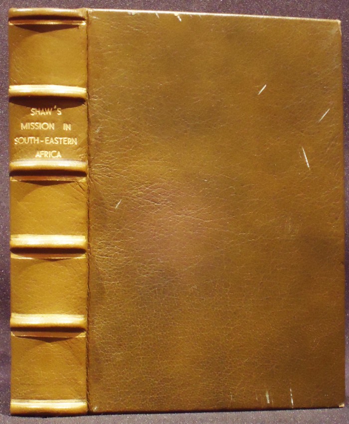 576 + 1 page appendix, folding map of South Eastern Africa as frontispiece (frayed at the top edge and repaired), 4 wood-engraved plates lightly foxed, recent full brown leather titled gilt on the spine and with patterned endpapers, marbled edges.