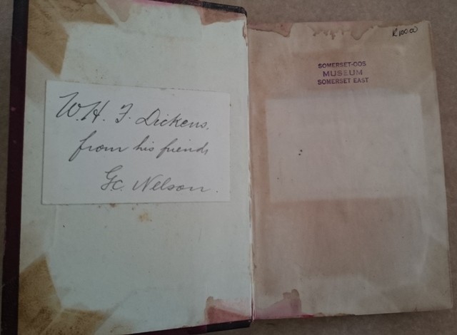 Condition: Board edges and corners rubbed; wear to front and rear. Front and rear hinges cracked and binding loose; offsetting to front and rear pastedowns. Inscription pasted to front pastedown; Somerset East Museum stamp to ffep; previous price in ink (!) on ffep. Stain to middle of pages 112 – 123 but text is still visible; page 130 loose. Text block sound. Exterior still good-looking. Fair to Good.