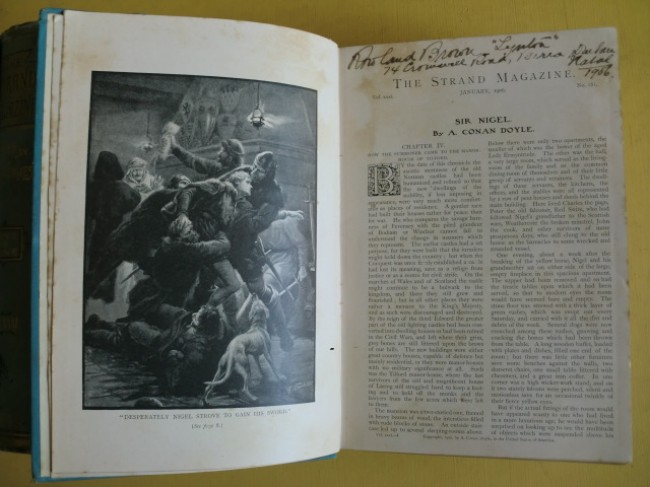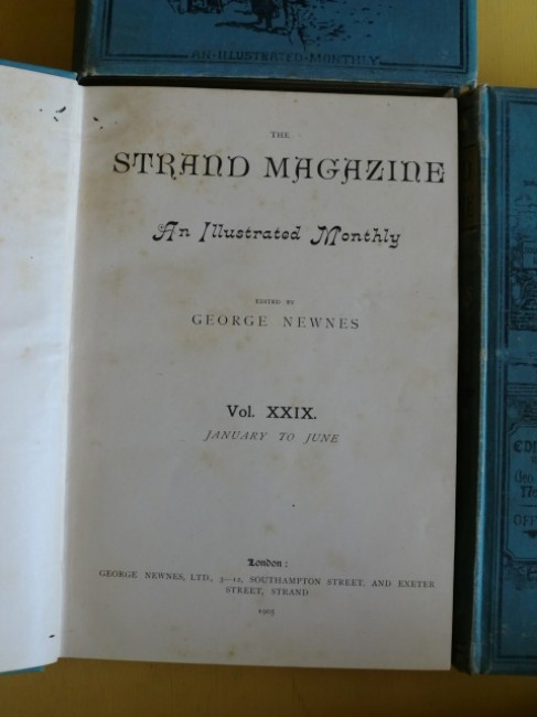 Seven original 'publisher-bound' volumes of the popular late Victorian general interest magazine, with black and white illustrations accompanying the texts - most notable for the inclusion of the Holmes detective stories, many of which are included here, with the original illustrations by Sidney Paget: The Hound of the Baskervilles, The Solitary Cyclist, The Adventure of Black Peter, The Adventure of Charles Augustus Milverton, etc... all volumes in overall good condition, though with varying amounts of foxing, and some with remnants of small worming to spine cloth and inner spine areas (now extinct, heavier on inner hinges of some volumes); gilt edges, boards rubbed, some volumes shaken with occasional loose pages. Reserve price reduced. Volumes included are: 24, 25, 27, 28, 29, 30 and 31 (six months per volume).