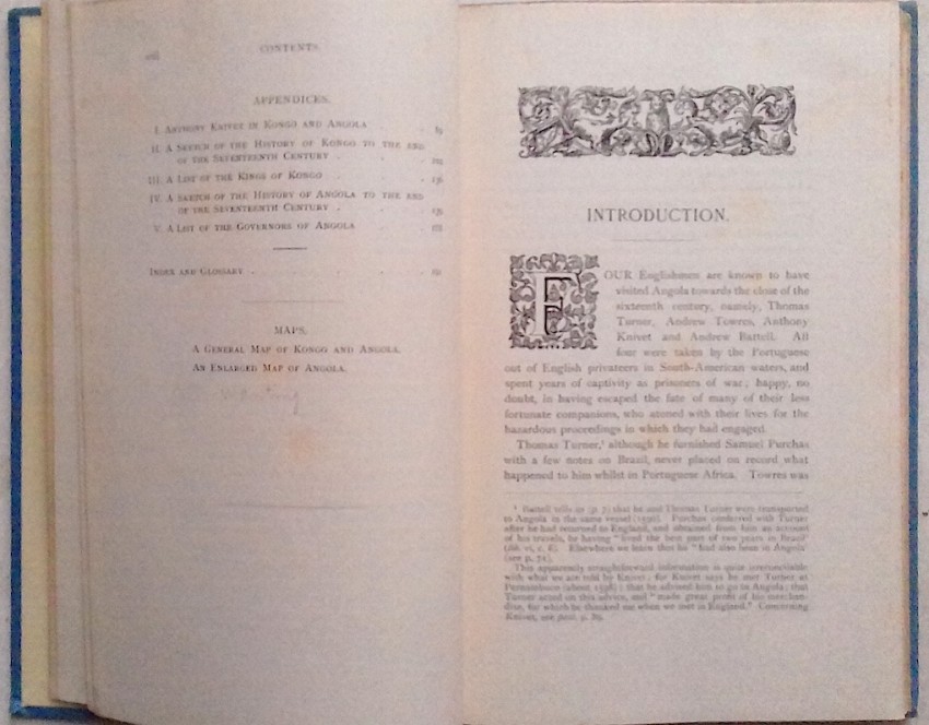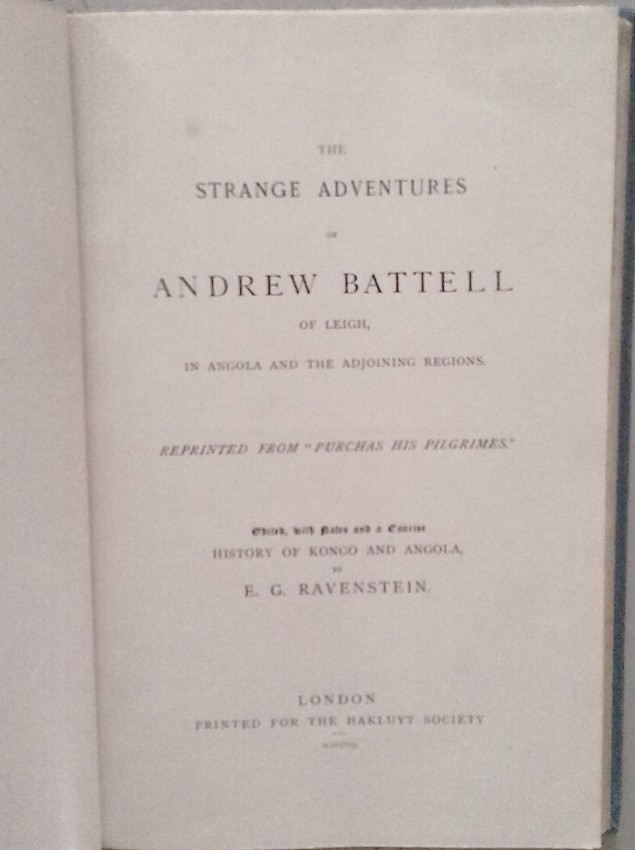 Battell, an Englishman, was captured by the Portuguese and spent 18 years in the Portuguese colonies of Angola and Congo, where he recorded his observations and experiences including trading, the Gagas, wars, cannibalism, customs, religions, witchcraft, one of the first recorded observations of the zebra and hippopotamus in English, with a good introduction and appendices on other travels in the Congo, Angola, list of Kong kings, governors, historical material, etc. In the famous "Purchas his Pilgrimes," published in 1625, Battell is referred to: "The strange adventures of Andrew Battell, of Leigh in Essex, sent by the Portugals prisoner to Angola, who lived there and in the adjoining regions near eighteen yeeres… Of the Provinces of Bongo, Calongo, Mayombe, Manikesocke, Motimbas; of the Ape Monster Pongo, their hunting; Idolatries; and divers other observations."