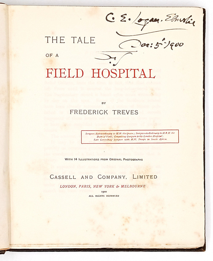 Mendelssohn (Sidney) South African Bibliography volume 2, page 523, ‘The author, one of the most eminent British surgeons of the day, went to Natal during the dark days of Buller's campaign in the South African War, 1899-1902, and his account of the sufferings of the wounded is extremely sad. The scope of the volume is confined strictly to a review of work in connection with the hospitals and ambulances, and there is no criticism of political or military matters. The Field Hospital described was known as " No. 4 Stationary Hospital," its name being something of a misnomer, as it moved with the column until the relief of Ladysmith, The first station it occupied was " Frere," where there were about 30,000 troops, and here Sir Frederick had an opportunity of seeing the effects of Boer looting.