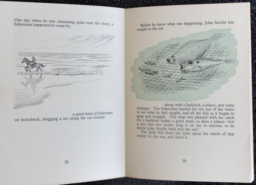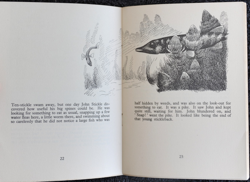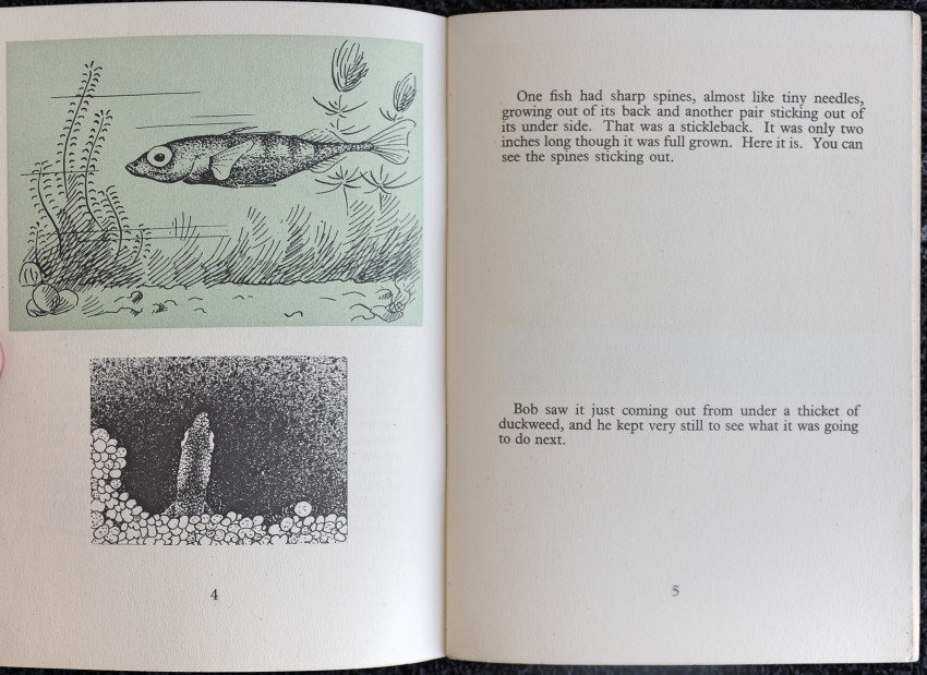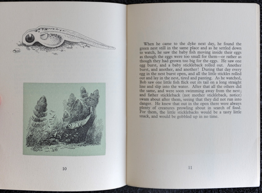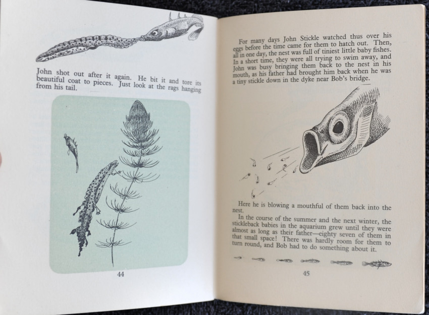 The stickleback is familiar to many a small child fishing with a jam jar and a twig, but few will know that these small fish, only three inches long, find their way in autumn by brook and stream to the sea where they live until the strengthening light of early spring calls them home again to the inland meadows. Sticklebacks make under-water nests in which the eggs are laid. The strange processes of this nest making are described fully. The male makes the nest, and also watches over the young, jealously protecting them from harm.