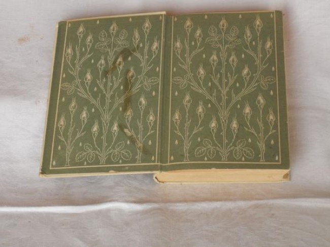 The beautifully decorated covers and spine of this rare book (which Fontein has not previously seen) are cream buckram boards with gilt-embossed lettering on cover and spine and with rose and green printed motifs. The green printed endpapers continue the design to the book, which has 507 pp followed by four pages of publisher's advertising.